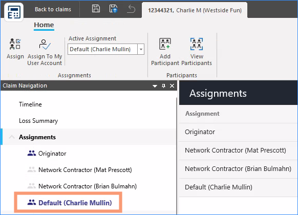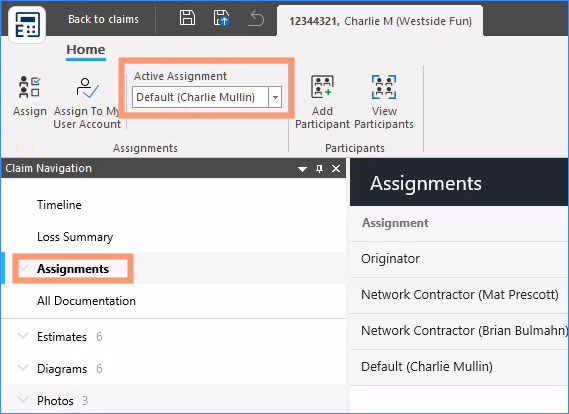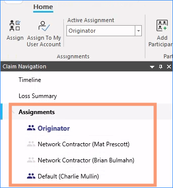 Look through the Claim Navigation pane and locate Assignments. Notice that the Originator assignment is bold, and that Mat Prescott is not. A bold assignment indicates that that assignment is currently active.
