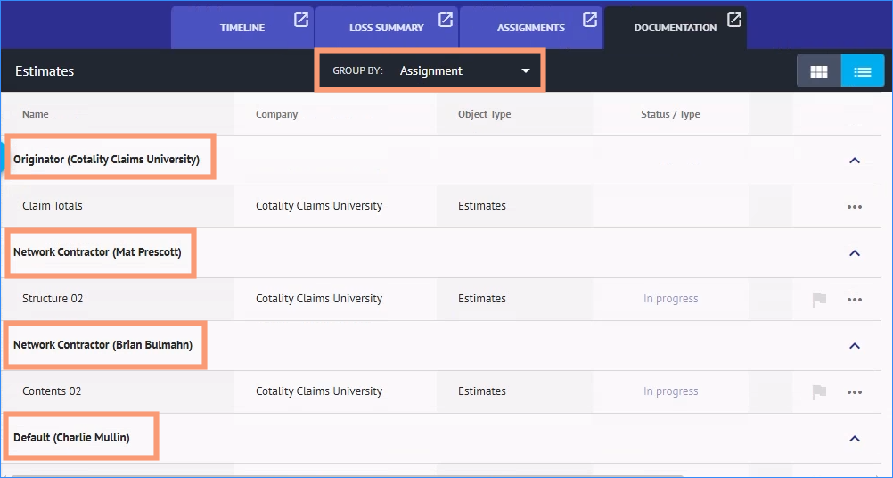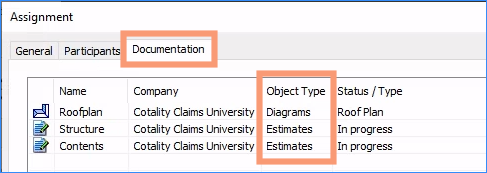Claim documentation is automatically associated with a specific assignment in Estimate and in Workspace when it is added. This is the Active assignment and it includes all objects in the claim: estimates, floorplans, forms, documents, photos, and photo folders.