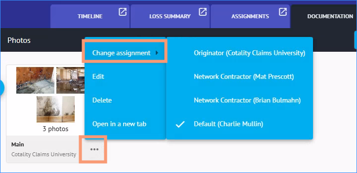 Open the claim and navigate to the Documentation tab, and select the element you are changing. In this case, we chose photos. Click the ellipsis, and click Change assignment. From there, choose the desired assignment.