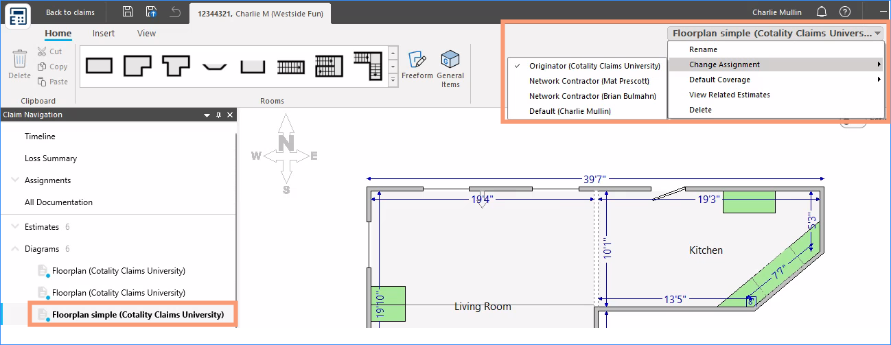 In this example, the Active assignment is Originator. When adding the diagram, a confirmation of the association appears at the bottom of the Claim Navigation pane. As the screenshot shows, you can select Change assignment, then select the Network Contractor (Mat Prescott) assignment below.