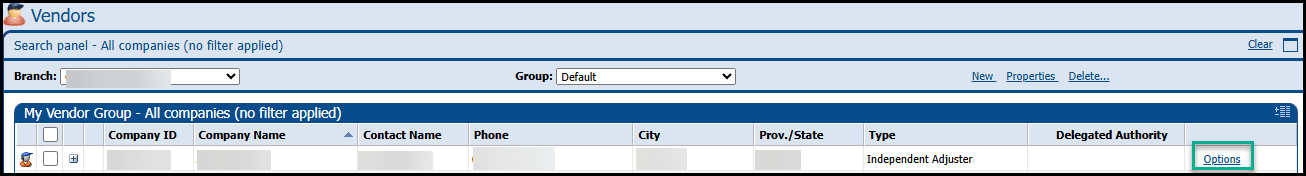 2. On the far right of the "My Vendor Group" table, click the link Options to view the available options for the vendor.