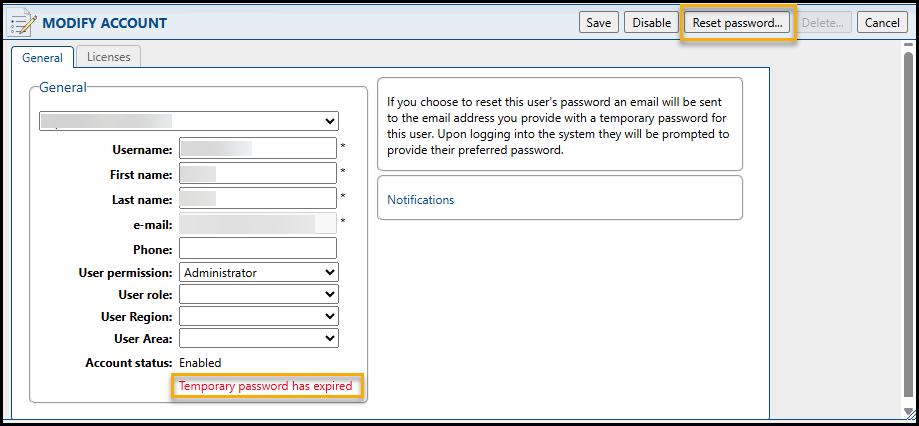 - Click Reset password to send a temporary password via email, this is especially useful for temporary passwords that have expired.