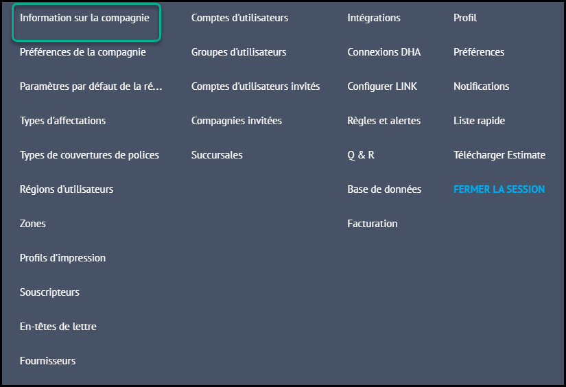- Si votre compagnie a été créée avec un type incorrect (ex. : Entrepreneur au lieu d’Expert en sinistre), veuillez contacter l’équipe de soutien afin de demander une modification.