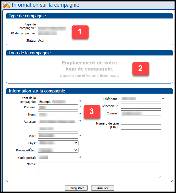 À partir de la page Information de la compagnie, les administrateurs peuvent mettre à jour :