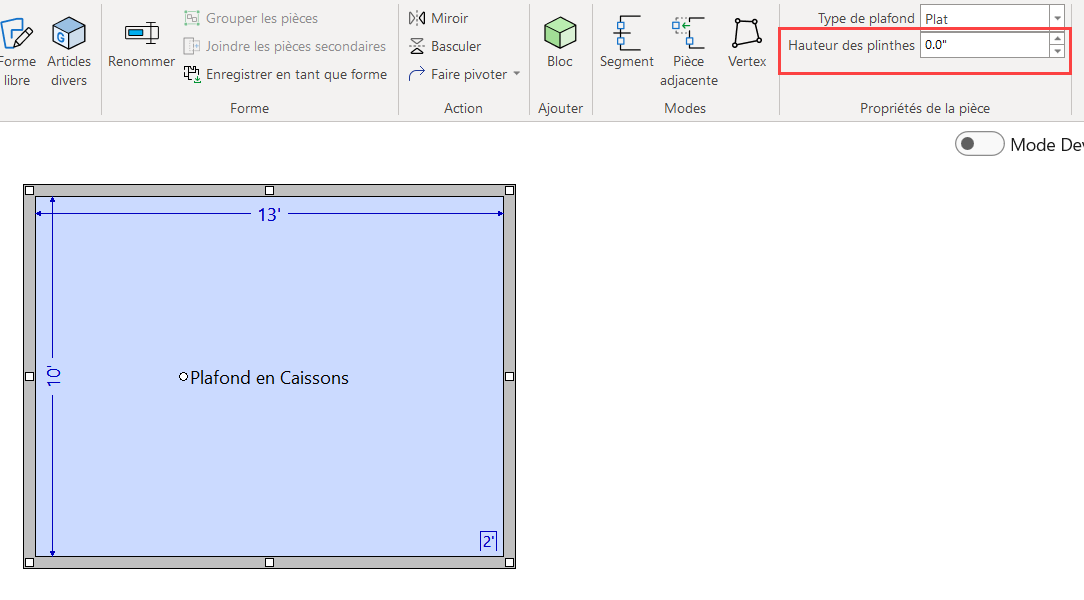 REMARQUE : Comme vous utilisez cette pièce comme caisson et non comme espace de vie, vous devez retirer les plinthes. Réglez la hauteur des plinthes à zéro dans le menu des propriétés de la pièce du ruban.