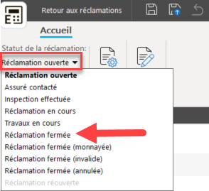 Fermer la réclamation : si cette réclamation est fermée, dans le statut de la réclamation, sélectionnez Réclamation fermée à partir du ruban du Sommaire de la réclamation.