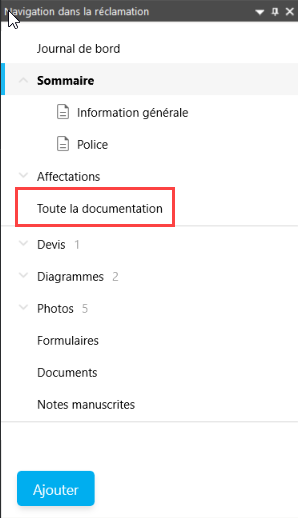 - Dans le Panneau de Navigation dans la réclamation, cliquez directement sur l'onglet Toute la Documentation