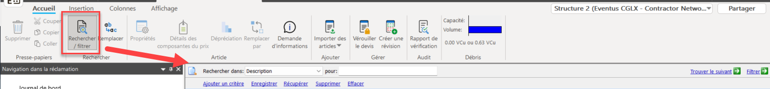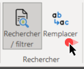 Ces outils sont disponibles à la fois dans Claims Workspace™ et dans Estimate™. Les boutons Rechercher/filtrer et Remplacer se trouvent dans le ruban du devis.