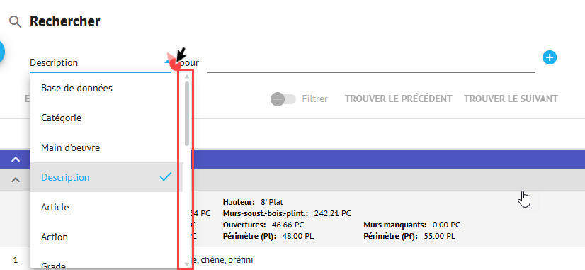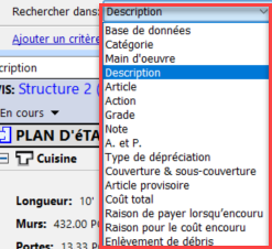 Par défaut, c'est "Description" qui est choisi. Cliquez sur le menu déroulant pour choisir d'autres options - par exemple, vous pouvez rechercher un métier spécifique en choisissant l'option "Main d'oeuvres" dans le menu déroulant, avant de saisir le nom de ce métier dans le champ de recherche, pour :.