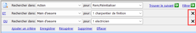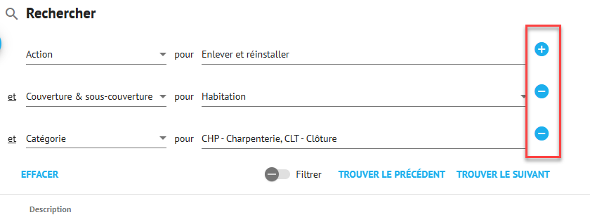 Contrairement à Estimate™ pour ajouter des critères de recherche, vous devez cliquer sur le signe + au bout de la première recherche, et pour supprimer, sur le - au bout de la recherche que vous voulez enlever de la recherche.