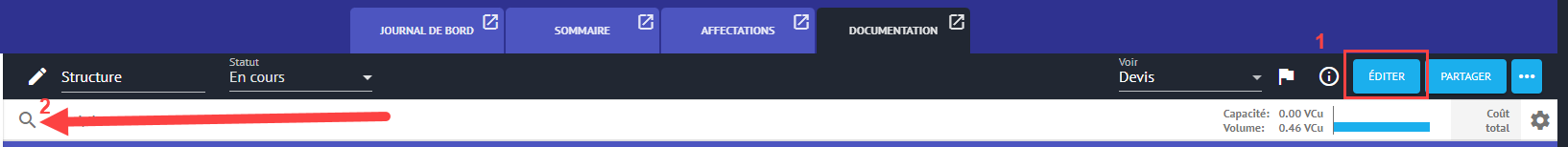 Commencez par cliquez sur ÉDITER en haut, à droite de votre devis. Ensuite cliquez sur la loupe complétement à gauche en haut du devis.