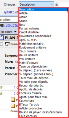 Article : Cliquez sur le lien <Sélectionner l'article de remplacement> pour choisir un autre article dans la base de données des prix dans une boîte de dialogue. Vous pouvez également cliquer sur le menu déroulant Options pour afficher d'autres options à appliquer aux articles :