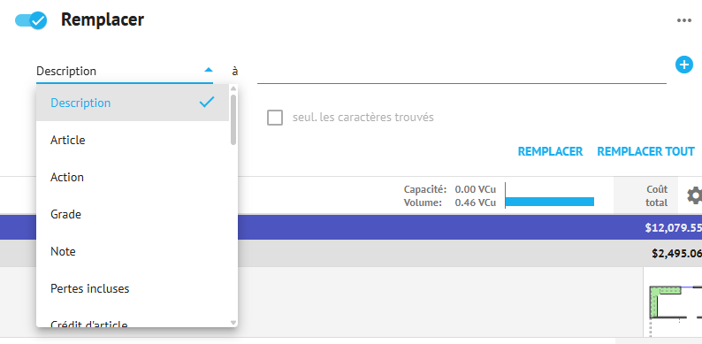 Rechercher/filtrer et Remplacer sont des outils puissants qui vous permettent de rechercher et de remplacer des articles et/ou des valeurs d'articles (tels que le prix des composants, la dépréciation et d'autres propriétés d'articles) dans un devis.