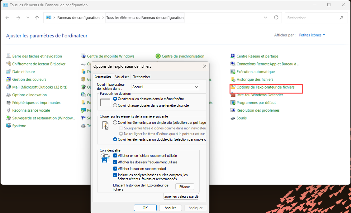 - Vous pouvez faire une recherche sur "Options de l'explorateur de fichiers. ".