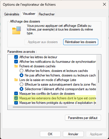 - Assurez-vous que l'option "Masquer les extensions des fichiers dont le type est connus" n'est pas cochée.