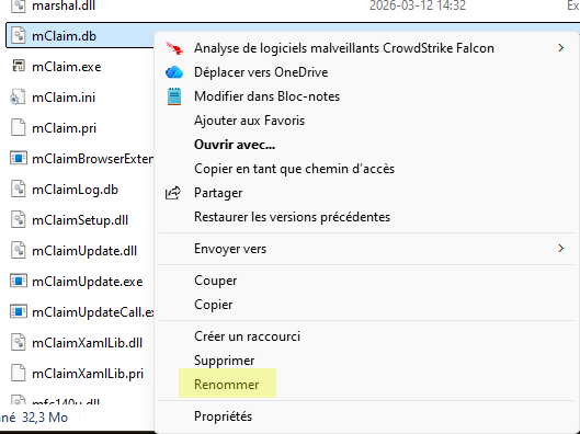 - Renommez le fichier en "mClaim.mdb_old" **Si mClaim.mdb_old existe déjà, il se peut que vous deviez l'appeler différemment. Dans ce cas, vous pouvez toujours ajouter la date au nom du fichier, par exemple : mClaim.mdb_old-Jan-15