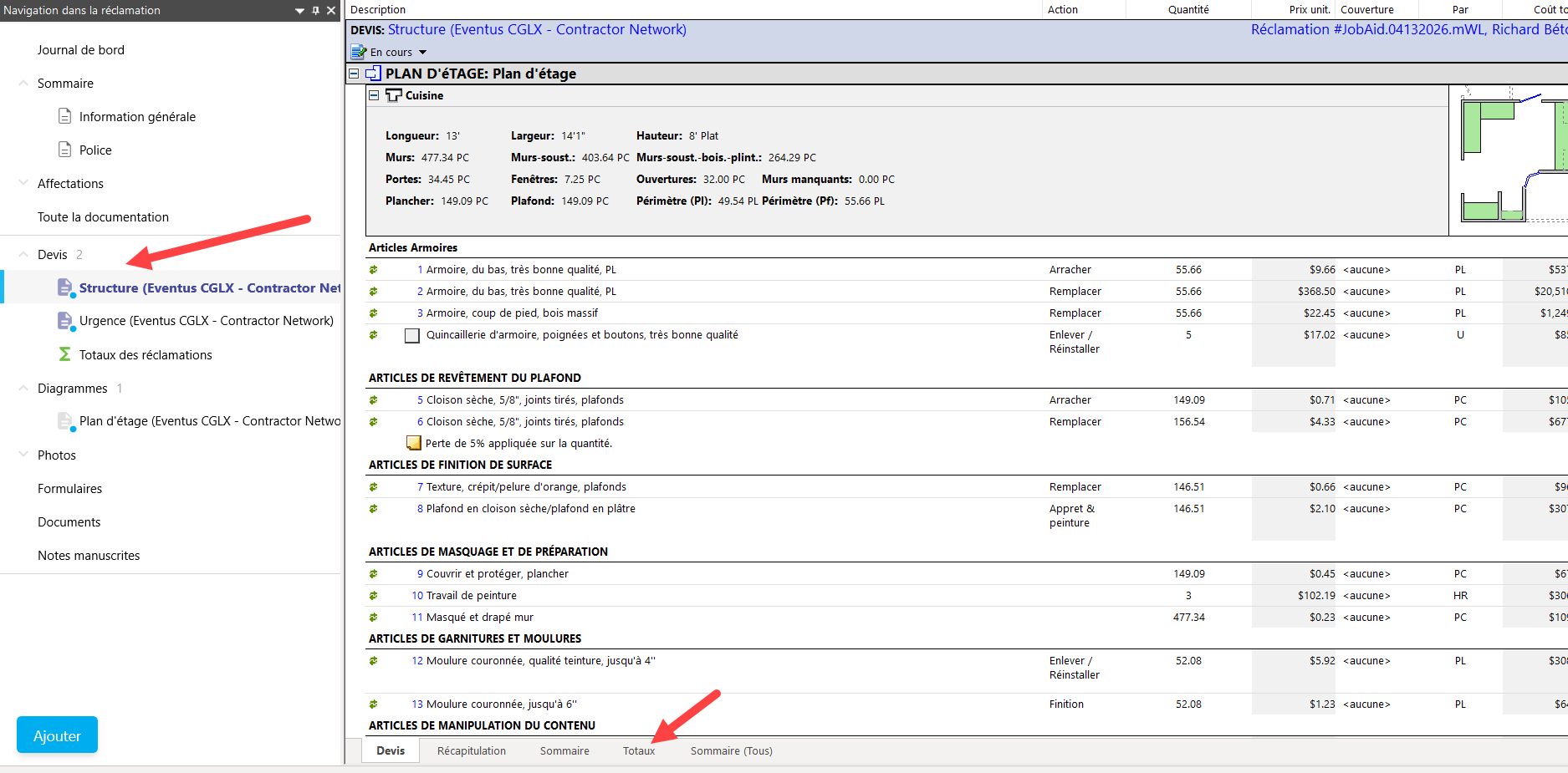 Étape 1 : Dans Estimate, cliquez sur le devis à retarifier. Cliquez ensuite sur l'onglet Totaux pour accéder à la page des totaux de ce devis.