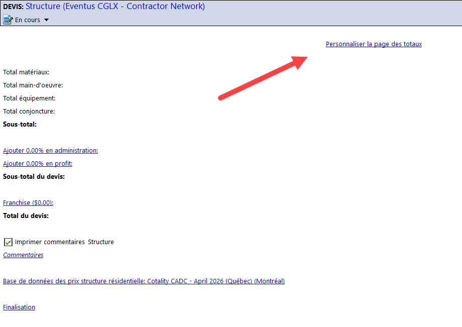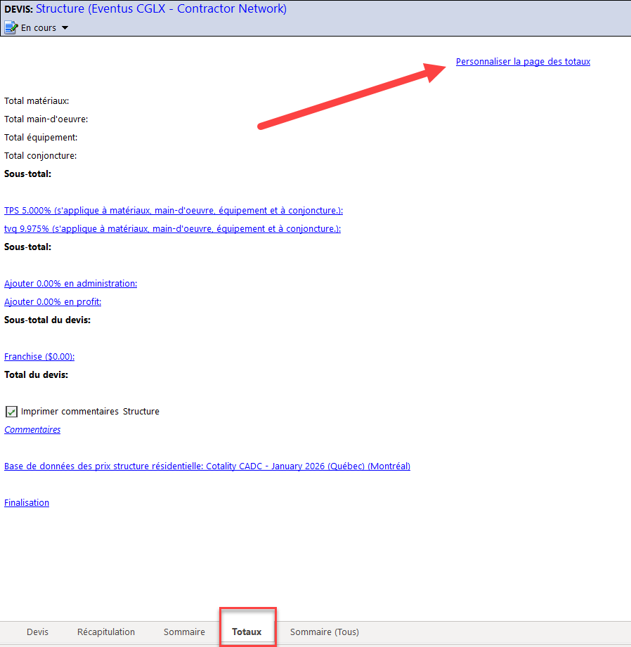 Étape 2 : À partir de la page des totaux, cliquez ensuite sur « Personnaliser la page des totaux » dans le haut de la page afin d'accéder aux propriétés du devis.