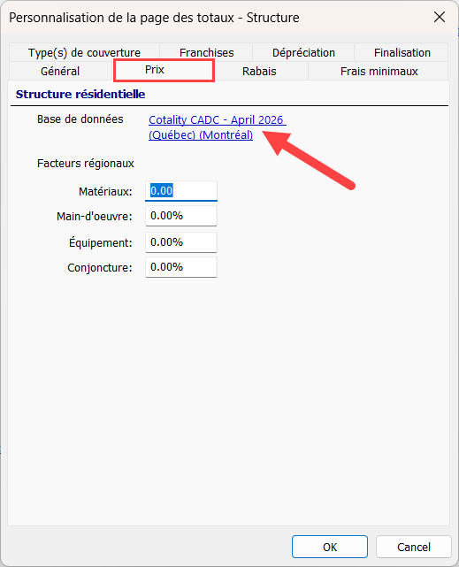 Étape 3 : Cliquez sur l'onglet « Prix » afin d'accéder aux propriétés de la base de données de prix liée à ce devis et cliquez ensuite sur la base de données pour accéder au menu de sélection de la base de données de prix.