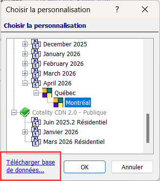 Étape 4 : Si la base de données que vous voulez utiliser pour la retarification n'est pas disponible dans le menu, vous devrez la télécharger en cliquant sur le lien « Télécharger base de données... ». Sélectionnez ensuite la base de données à utiliser, puis cliquez sur le bouton Télécharger. Une barre de progression apparaîtra alors à l'écran, et c'est seulement lorsque le téléchargement sera complété que vous pourrez sélectionner la base de données à utiliser pour la retarification.