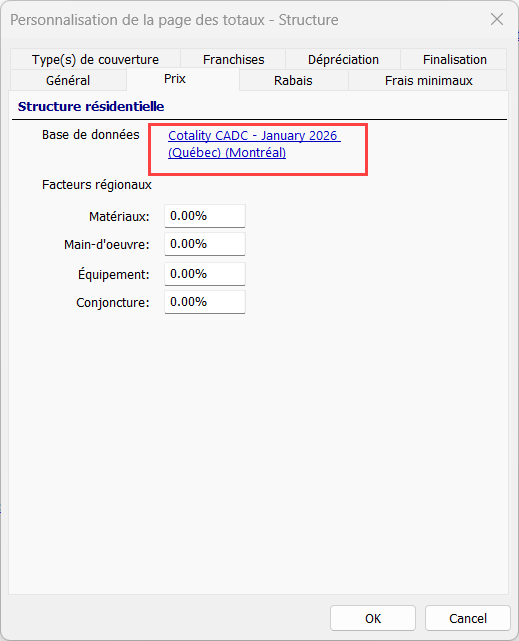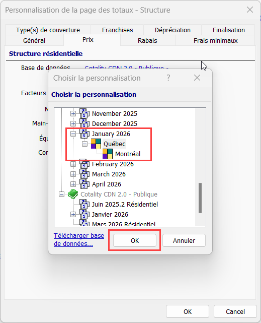 Étape 5 : Sélectionner la base de données (publiée après la base de données November 2022 (Pre-Dec 4th)) à partir de la liste des bases de données disponibles et cliquez sur « OK » pour appliquer les prix de cette base de données à votre devis existant. Le nom de la base de données sélectionnée s'affichera alors sous la section Structure résidentielle.