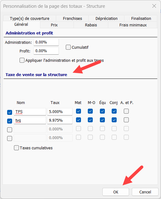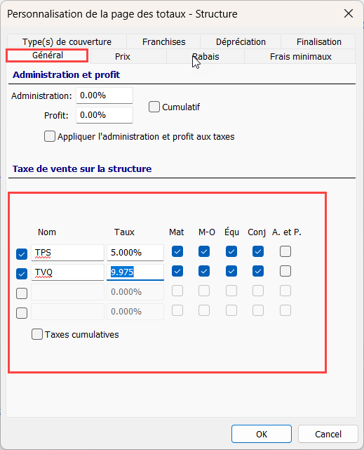 Étape 6 : Cliquez ensuite sur l'onglet Général afin de sélectionner la bonne table de taxes à associer à cette base de données de prix. Sous la section Taxe de vente sur la structure, cliquez sur « Personnalisé » pour faire apparaître la liste des tables disponibles. Sélectionnez la table « Structure ». Tout dépendamment de votre région, cette sélection modifiera la configuration des taxes située sous la liste de sélection de la table de taxes. Cliquez « OK » pour accepter le changement.