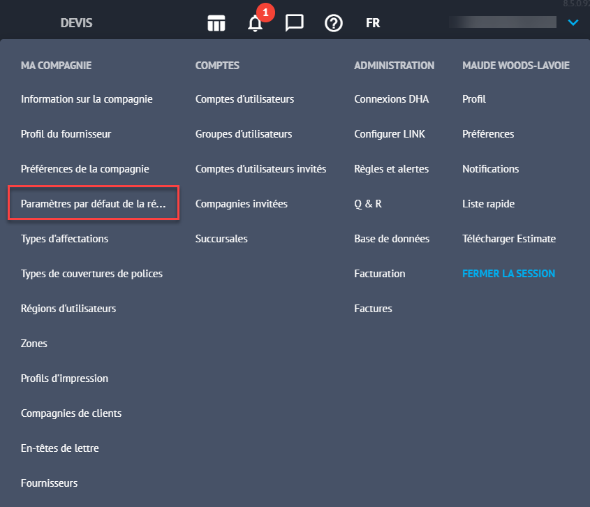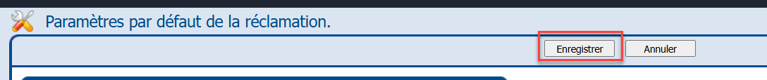 Étape 1 : La configuration des taxes pour l'entreprise doit être effectuée par un usager avec des droits d'administrateur. Cliquez sur « Paramètres par défaut de la réclamation ».