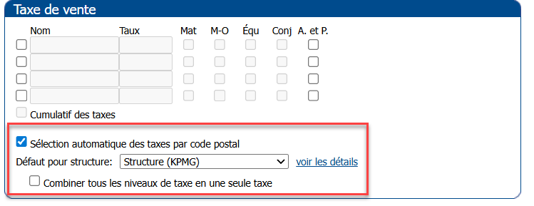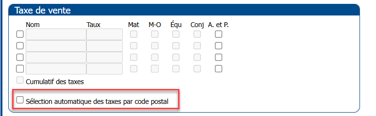 Étape 2 : Dans la fenêtre de « Paramètres par défaut de la réclamation », allez dans la section « Taxe de vente » et cochez la case « Sélection automatique des taxes par code postal ». Cette action affichera une liste déroulante des tables de taxes disponibles.
