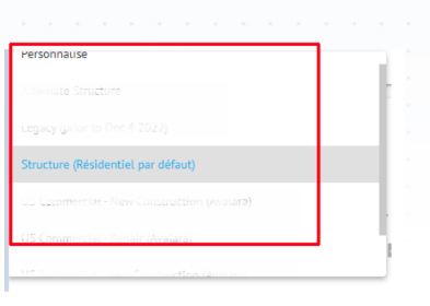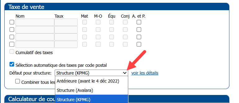 Étape 3 : Cliquez à n'importe quel endroit à l'intérieur de la section « Taxe de vente sur la structure » pour afficher toutes les informations sur la configuration des taxes incluant la liste déroulante permettant de sélectionner une table de taxes différente.