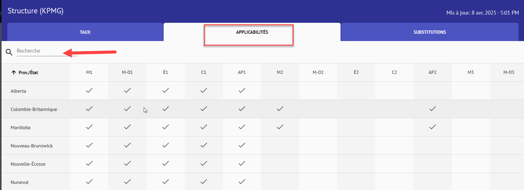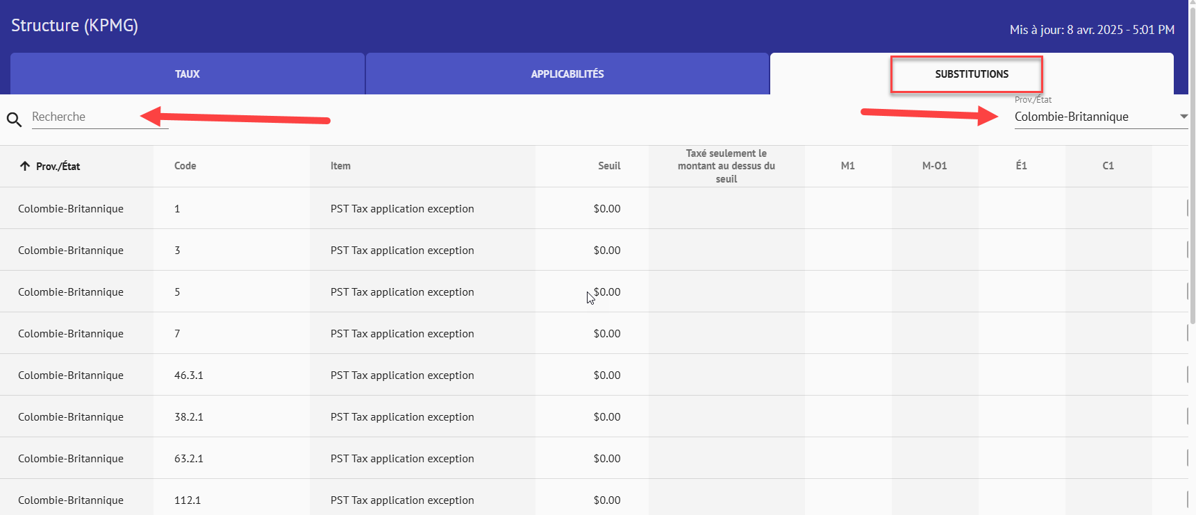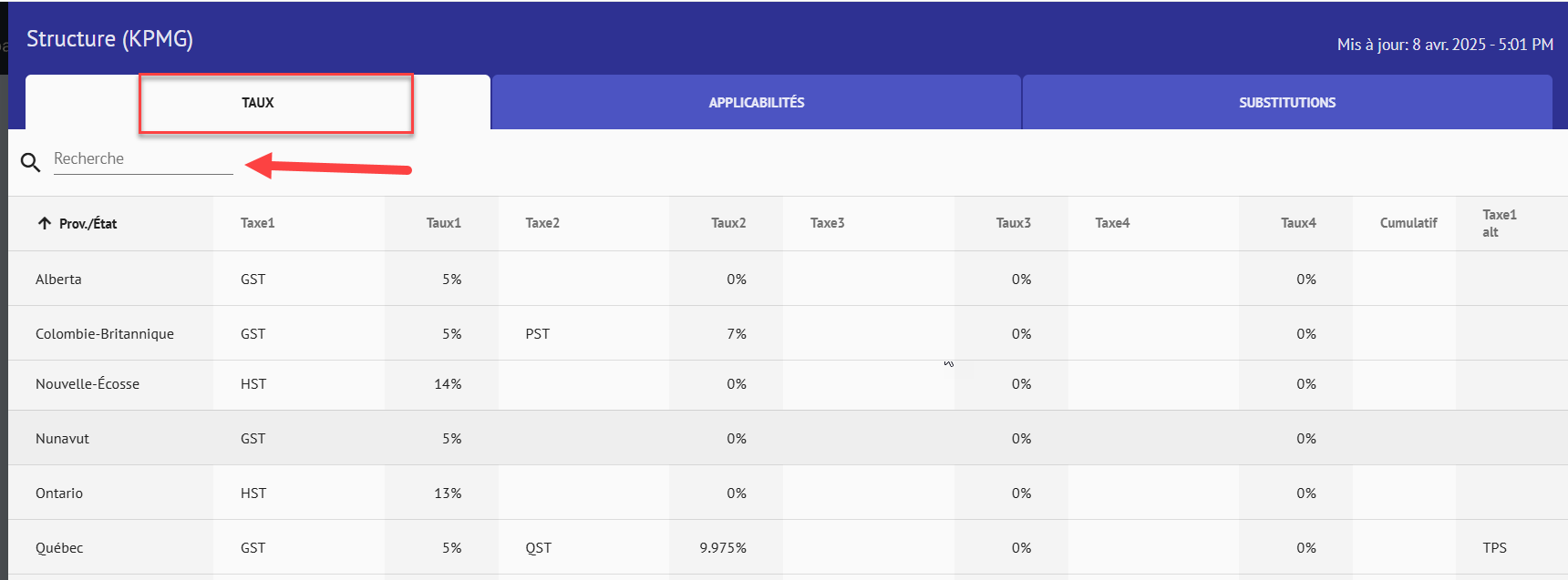 Étape 4 : Cliquez sur « voir les détails » à la droite de la table de taxes sélectionnée afin de visualiser les taux, les applications et les exceptions associés à cette table de taxes. Il vous sera possible d'utiliser l'outil de recherche situé dans le coin supérieur droit pour filtrer les informations affichées. À noter qu'il y a une liste déroulante dans la table des exceptions afin de sélectionner la province à visualiser.