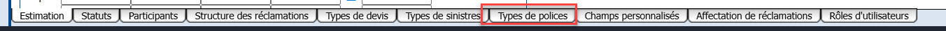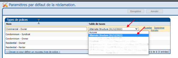 Étape 1 : Il vous est possible de définir une table à associer à un type de police d'assurance si ce type de police doit utiliser une table de taxes différente de ce qui a été défini par défaut pour la compagnie. Pour ce faire, l'administrateur doit cliquer sur l'onglet « types de polices » dans le bas de l'écran des « Paramètres par défaut de la réclamation » et cliquer sur la liste déroulante située à la droite du nom du type de la police. Cliquez ensuite sur « Accepter » et « Enregistrer » pour confirmer la sélection.
