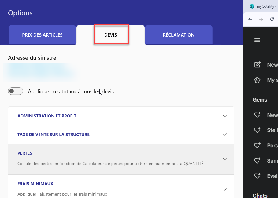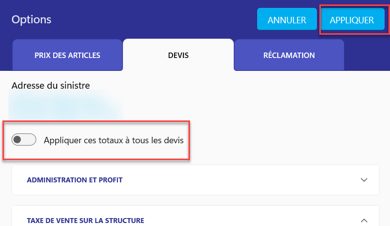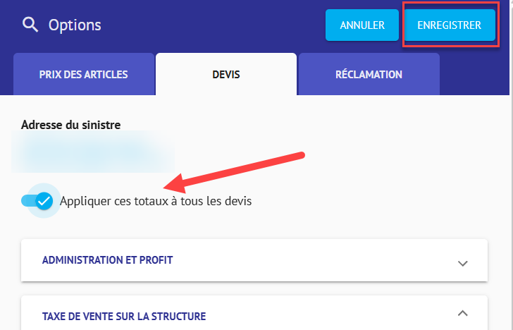 Étape 4 : Pour appliquer les changements à tous les devis présents dans la réclamation, activez le bouton prévu à cet effet (« Appliquer ces totaux à tous les devis ») et sélectionnez « Enregistrer ».