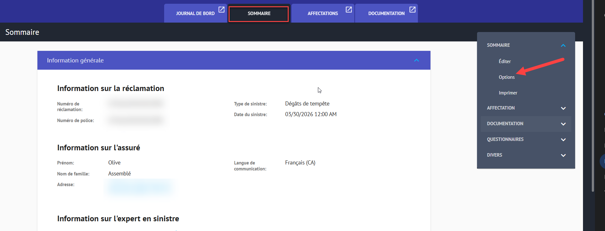 Étape 1 : Cliquez sur l'onglet « Sommaire » dans la réclamation et cliquez ensuite sur « Options » dans le menu à la droite de l'écran.