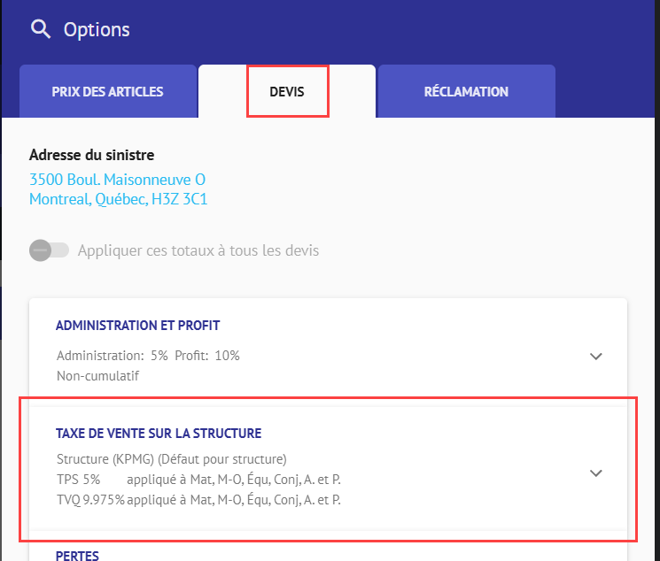 Étape 2 : Dans le volet « Options », cliquez sur l'onglet « Devis » pour afficher les informations financières de la réclamation incluant les informations sur la table de taxes associée.
