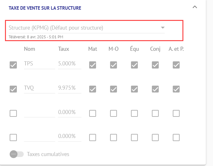 Étape 2 : Cliquez sur Taxe de vente sur la structure. À ce point-ci, il vous sera possible de voir quelle table de taxes est associée à cette réclamation. Cliquez sur le nom de la table pour afficher les autres tables disponibles. La configuration liée à la table de taxes sélectionnée s'affichera dans la section située sous le nom de la table.