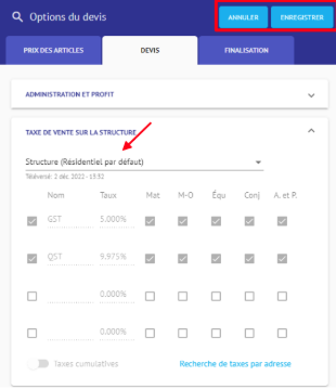 Étape 2 : Dans le volet « Options du devis », cliquez sur l'onglet « Devis ». Cliquez à n'importe quel endroit à l'intérieur de la section « Taxe de vente sur la structure » pour sélectionner une table de taxes différente via la liste déroulante.
