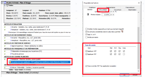 Étape 1 : Si un article ajouté au devis possède des exceptions au niveau des taxes, l'usager verra automatiquement une note ajoutée à cet article. En ouvrant les propriétés de l'article, l'usager verra également la raison de l'exception.