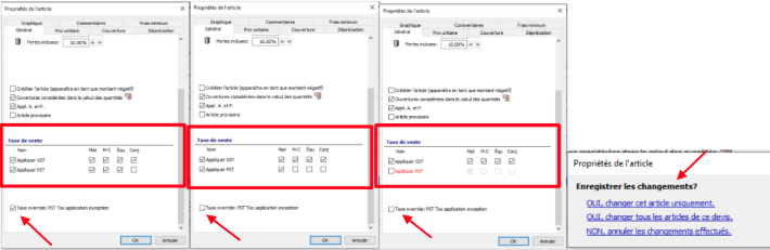 Étape 2 : Pour modifier la configuration automatique, retirez le crochet au niveau de l'exception de la taxe. Si des modifications supplémentaires sont effectuées, le nom de la taxe s'affichera en rouge. Cliquez sur « OK » et choisissez l'option désirée dans la fenêtre « Enregistrer les changements ? » (ex. : changer cet article uniquement ou tous les articles du devis).