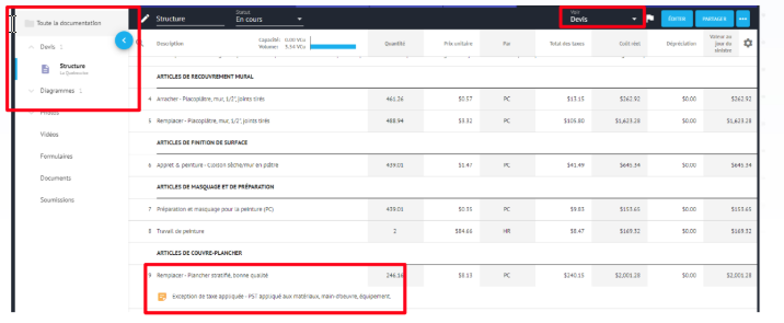 Appliquer les exceptions au niveau des items d'un devis dans Workspace