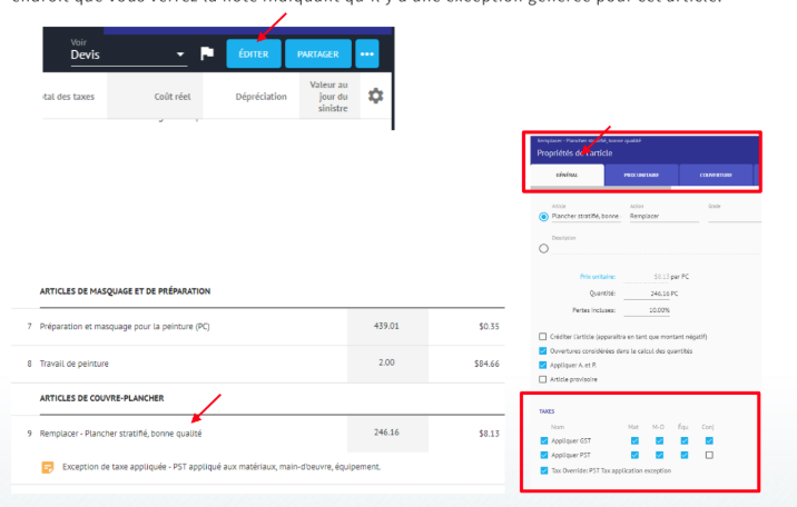 Étape 2 : Cliquez sur « Éditer » dans la barre en haut du devis et cliquez ensuite sur l'article qui comporte une exception. Le volet Propriétés de l'article s'affichera et la section "Général" sera présentée automatiquement. Vous retrouverez une section intitulée Taxes dans le bas du volet. C'est à cet endroit que vous verrez la note indiquant qu'il y a une exception générée pour cet article.
