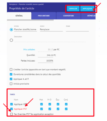 Étape 3 : Pour modifier la configuration automatique appliquée à l'article, retirez le crochet au niveau de l'exception de la taxe. Si vous effecuez des modifications supplémentaires à la configuration de la taxe alors le nom de la taxe s'affichera en rouge pour vous informer que vous n'utilisez plus la configuration normale pour cette province. Les boutons "Appliquer" et "Annuler" apparaîtront dans le haut de la fenêtre. Cliquez "Appliquer" pour conserver vos changements. La note associée à l'article sera automatiquement modifiée en fonction des changements apportés.