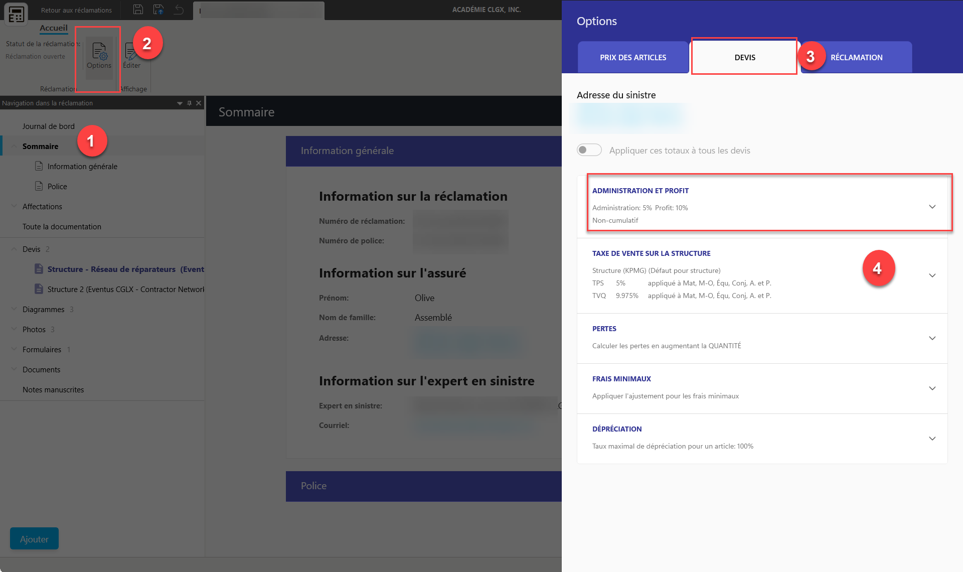 Ceci vous guidera à travers les étapes à suivre pour appliquer les frais d'administration et le profit aux taxes au niveau de la réclamation et/ou au niveau du devis dans Estimate™. Ceci ne s'applique qu'aux taxes qui ne sont pas paramétrées pour être appliquées aux fraix d'administration et aux profits.
