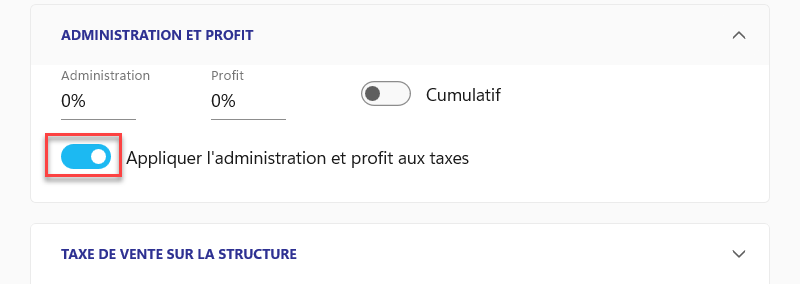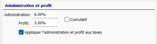 - Configurer l'option d'application des frais d'administration et le profit aux taxes au niveau du devis