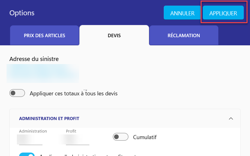 5. Basculez le bouton radio pour activer l'option Appliquer l'administration et profit aux taxes pour la réclamation.