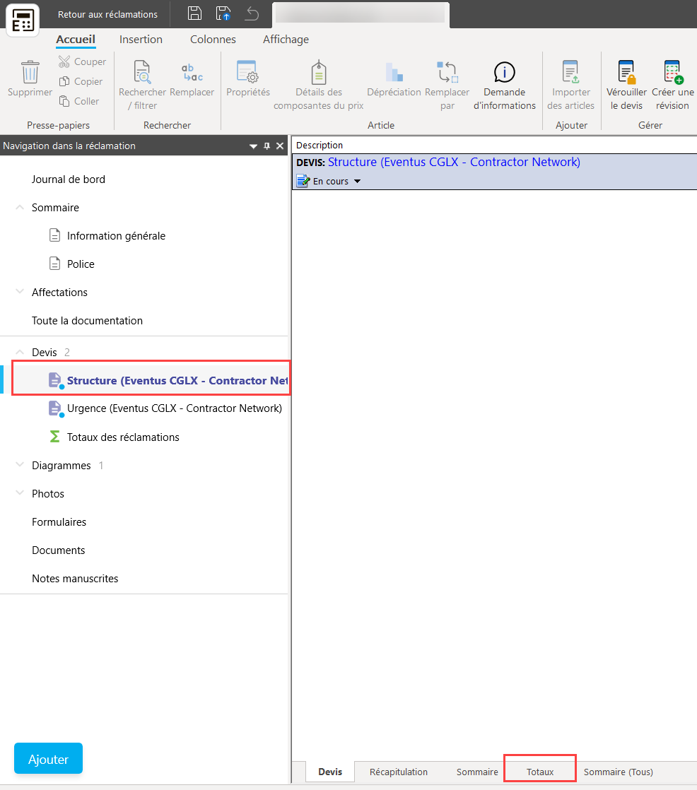1. Naviguez jusqu'à la page Totaux du Devis via la rubrique Structure.