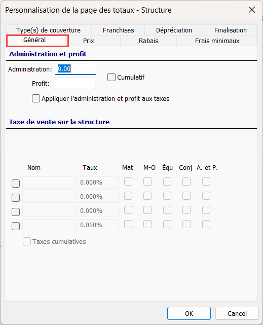3. Dans l'onglet Général de la boîte de dialogue Personnlaisation de la page des totaux- Structure, accédez à la section Administration et Profit.