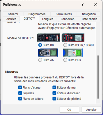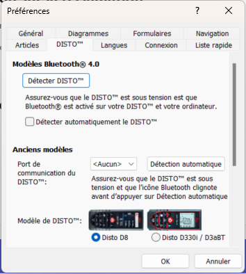Choisissez le bon modèle de Disto et cliquez sur Détecter DISTO (cochez Détecter automatiquement le DISTO pour détecter automatiquement l'appareil dans le futur).