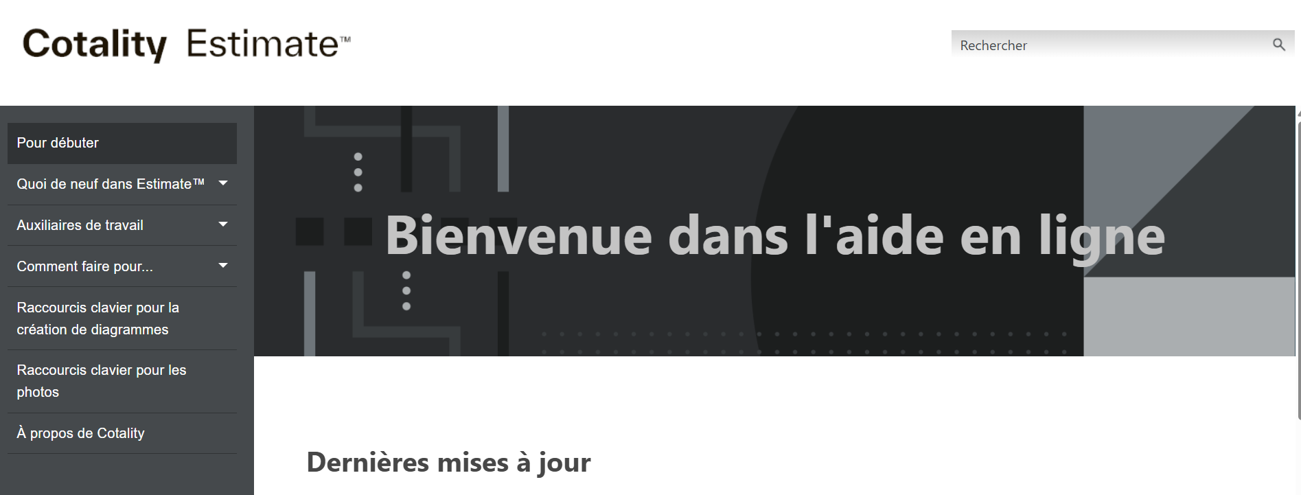 L'aide d'Estimate™ dans l'application est accessible en cliquant sur le symbole " ?" en haut à droite d'Estimate. En cliquant sur le symbole " ?", vous accédez directement à la page d'aide correspondant à la section. Si vous accédez au guide de l'utilisateur de Cotality à partir d'Estimate, cliquer sur le symbole " ?" ouvrira une fenêtre dans votre navigateur web, liant directement à la section pertinente du guide de l'utilisateur.